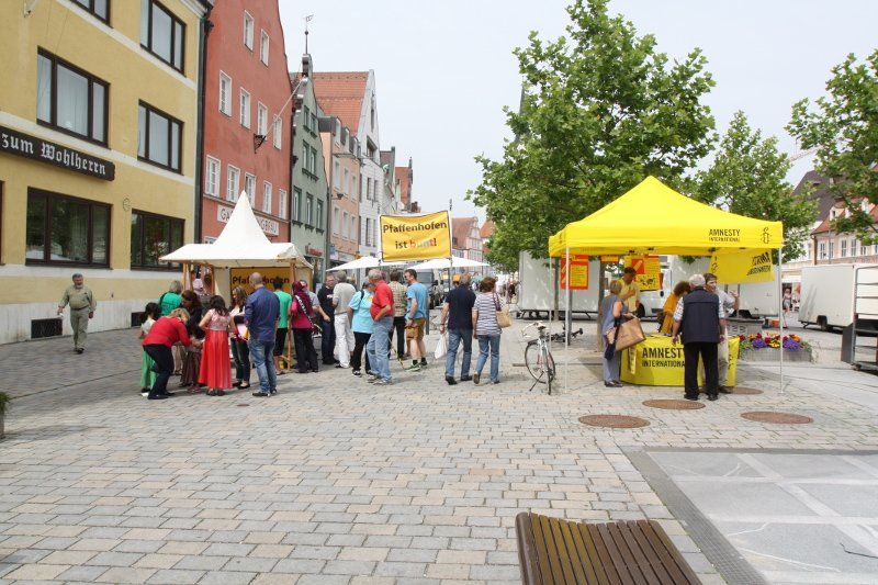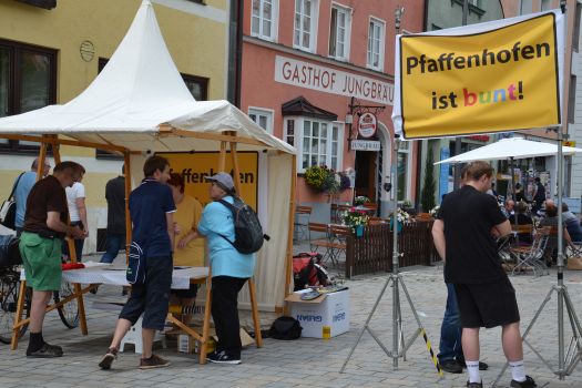 Diese konnten bereits ab 9:30 auf dem Markt ein T-Shirt, Cap oder Aufkleber mit dem Slogan "Pfaffenhofen ist bunt" erwerben. Die Aktion zielte vor allem als Reaktion auf die angekündigte Demo gegen die Moschee ab. Bereits nach zwanzig Minuten waren am Stand fast alle Shirts verkauft.