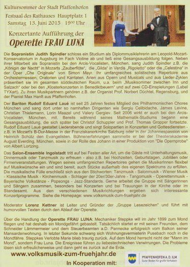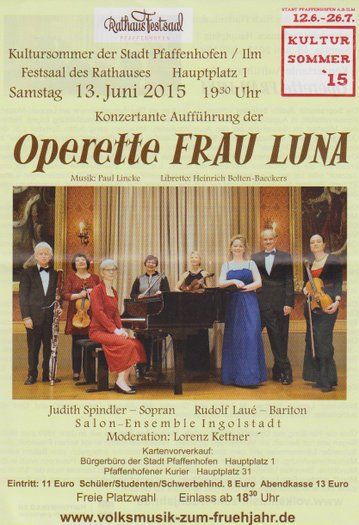Die Operette „Frau Luna“ des Komponisten Paul Lincke nach einem Libretto von Heinrich Bolten-Baeckers, wurde im Rahmen des Kultursommers Pfaffenhofen 2015 gegeben. Der Berliner Mechaniker Steppke hat ein Gefährt entwickelt, mit dem er und seine beiden Freunde Lämmermeier und Pannecke zum Mond ¬ fliegen wollen. Um der Vermieterin Frau Pusebach zu entkommen, starten sie zu einer nächtlichen Mondfahrt. Der Mond scheint ein ewiger Vergnügungspark zu sein, Prinz Sternenschnuppe liebt Frau Luna, doch diese interessiert sich momentan nur für Steppke.