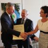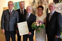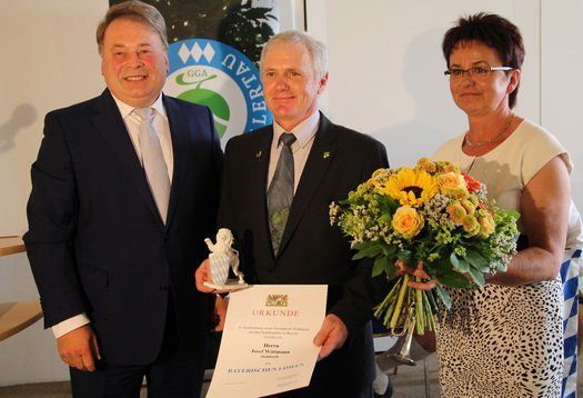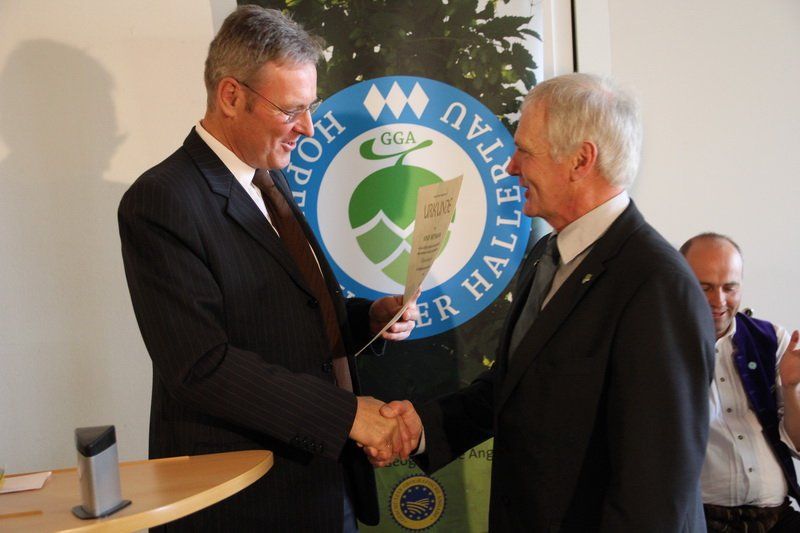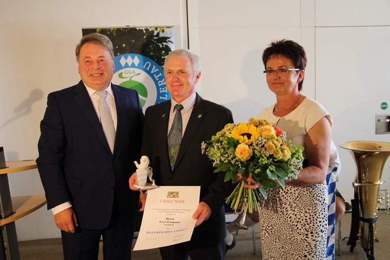 „Schön reden tuts nicht, die Tat ziert den Mann“, mit diesem Zitat von Adolf Kolping würdigte Landwirtschaftsminister Brunner das was Josef Wittmann über zwei Jahrzehnte für den Verband ehrenamtlich geleistet hat. Nicht nur konnte unter seiner Amtzeit die Hallertau den Weltmarktanteil von 20 auf 40% erhöhen, auch in Sachen Qualität setzte Josef Wittmann Maßstäbe. „Der Weg war nicht immer leicht“, erklärt Johann Pichlmeier, Präsident des Deuschen Hopfenpflanzerverbandes. Vor allem die Umstellung der Verbandsbeiträge kostete viel Überzeugungskraft. Auch das Pflanzenschutz-Monitoring wurde unter seiner Amtszeit eingeführt. Für all diese Verdienste rund ums „grüne Gold“ überreichte ihm Staatsminster Helmut Brunner den bayerischen Löwen.