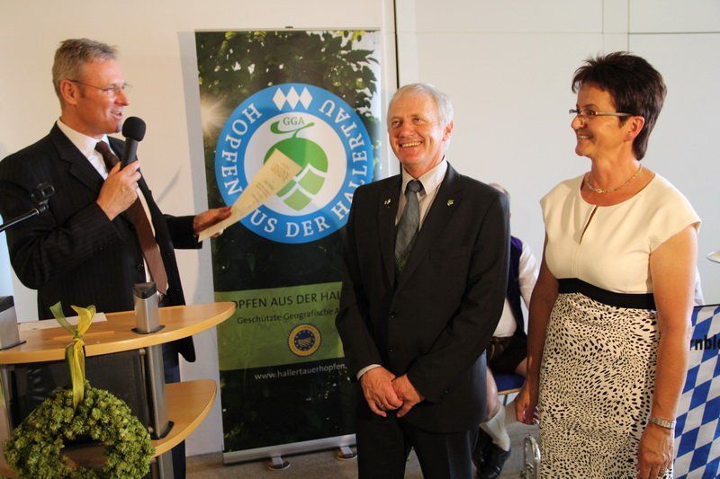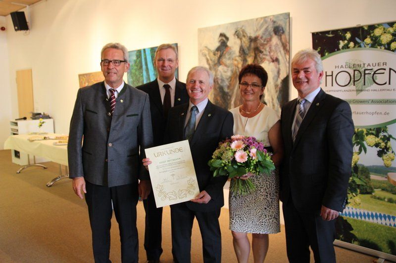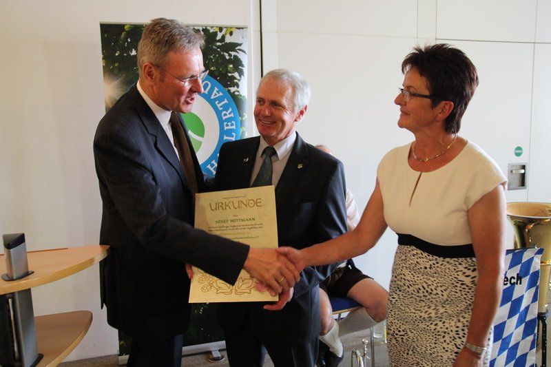 „Es ist alles andere als eine Selbstverständlichkeit, dass ein Pflanzer sein Wissen in den Dienst der Sache stellt“, so Dr. Lothar Ebbertz vom Bayerischen Brauerbund. Über 100 Termine im Jahr, dazu Besuche auf Messen, waren keine Seltenheit und kosteten neben der Zeit oft auch Mühe. So galt der Dank an dieser Stelle eben nicht nur Josef Wittmann alleine, sondern auch seiner Frau Anneliese. Sie war es, die ihm über viele Jahre den Rücken für dieses Ehrenamt nicht nur freigehalten, sondern auch gestärkt hat. Vieles konnte er in den vergangenen 20 Jahren umsetzen. „Er war ein Macher, ein Vordenker“, so der Minister. So ist es auch sein Verdienst, dass heute rund 90% aller Hallertauer Pflanzer im Verband sind. Doch Wittmann hatte eben nicht nur Augen für die Hopfenbauern, sondern interessierte sich in gleicher Weise auch für die Belange der Hopfenwirtschaft und der Brauer. „Er hat über die Jahre viele Probleme erkannt und in gemeinsamen Gesprächen nach Lösungen gesucht“, so Peter Hintermeier, Vorsitzender des Hopfenwirtschaftsverbandes.