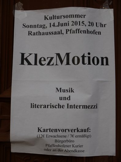 Ein feinsinniges Klezmer-Konzert mit integrierter Lesung gab es zur Sommerkultur 2015 im anscheinend extra heißen Rathaussaal zu Pfaffenhofen. Im kleinen Schwarzen und mit eindringlicher Stimme zwang die Moderatorin und Schauspielerin Petra Papke das Publikum zu gebotener Aufmerksamkeit vor dem ersten Musikstück jiddischer Art.