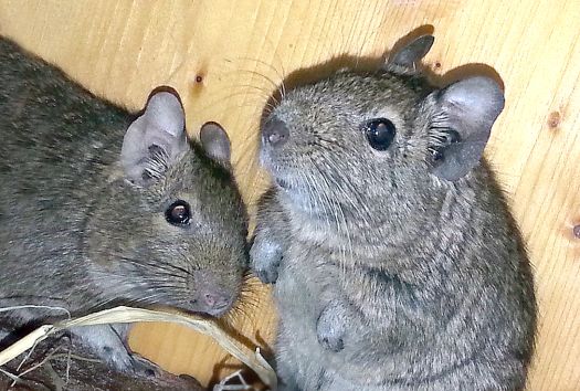 Die beiden Degus Bonny und Clyde sind zwei beziehungsweise drei Jahre alt und haben sich in der Tierherberge kennen- und lieben gelernt. Degus sind Sippentiere mit großem Bewegungsdrang und möchten viele Kletter- und Spielmöglichkeiten, außerdem sie vergraben sich gerne. Kurz, sie brauchen ein großes Gehege anstatt der handelsüblichen, viel zu kleinen Käfige.