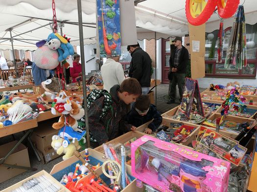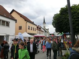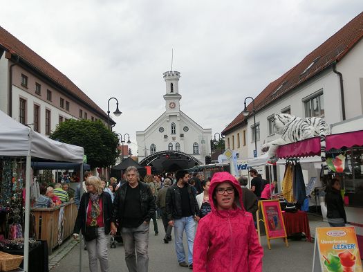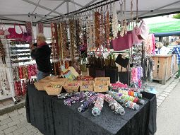 Zahlreiche Besucher drängten sich trotz des kühlen und manchmal regnerischen Wetters durch die zahlreichen Buden und Stände, die entlang der Marktstrasse aufgebaut waren. Haushaltwaren, Spielzeug, Blumen und Kräuter, Kleidung, Käse oder feine Teesorten - das Angebot war riesig. Dazwischen immer wieder kleine Zelte zum Verweilen und Essen, Stände der Wasserwacht mit Kuchen und Schokofrüchten oder des TSV mit selbstgemachten Crepes.