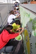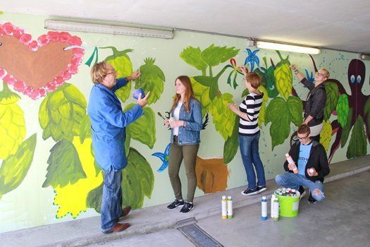 Grundschule, Mittelschule und Gymnasium lassen jetzt ihre ganze Kreativität spielen und verwandeln die Zufahrt in ein buntes Riesengemälde voller Farbe und Dynamik. Nachdem die Firma Dierl die Betonwände entsprechend grundierte, tobten sich als erste die Gymnasiasten im Kurvenbereich der Einfahrt aus. Riesige Hopfendolden, Blumen, ein Tintenfisch der in die Tiefe führt… man darf gespannt sein, was sich die Schüler des Kunst Additums noch einfallen lassen. Christian Kuttler, der Zuständige für betreutes Malen, betont, dass die Ideen zur Gänze den elf Schülerköpfen des Kurses entspringen und alle noch gute Lust haben, weiter zu malen. „Es wär schon wenn irgendwann die ganze Kurve voll wird“.
