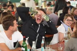 Regelmäßig ausgetauscht („DU bist dro mi’m Nachschub hoin! Etz brauchma de Nummer Fümf!“) oder stolz am Tisch sammelnd („De zwoa do hob i alloa gsuffa!“ – „Ja, so schaugst aa aus…“) – egal mit welcher Methode die Flaschen an jedem Tisch akquiriert wurden, getrunken und genossen wurde nicht wenig. Für die Damen ein süffiger Weißherbst Rosé oder für die Herren der Schöpfung ein kantiger Merlot – durstig blieb bei der überzeugenden Weinkarte niemand. Musikalisch brachten die Kolibris Stimmung ins Haus und drückten bekannten Volksfest-Partyliedern ihren ganz eigenen Stempel auf.