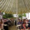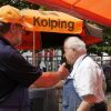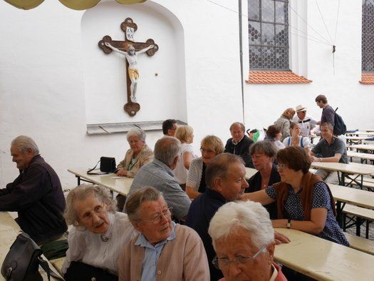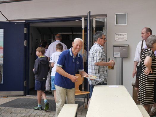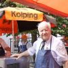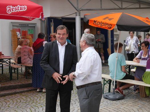 Stadtpfarrer Peter Wagner feierte sein erstes Pfarrfest am Biertisch mit wachsender Begeisterung. Der Kontakt zur Gemeinde geht sicher auch durch den Magen, das gesellige Gespräch, auch mal zu Alltäglichem, ist Teil der Seelsorge. Ein großes Lob der Kolpingfamilie und den vielen freiwilligen Helfern, beste Versorgung, tolle Organisation und wie die Sache mit dem Wetter läuft, bekomme ich auch noch raus.