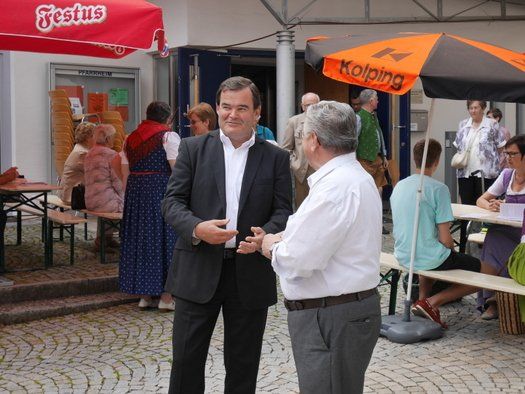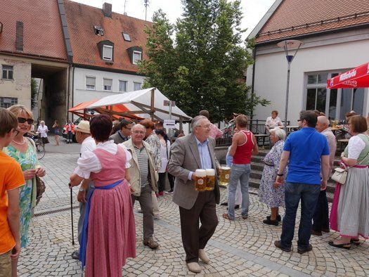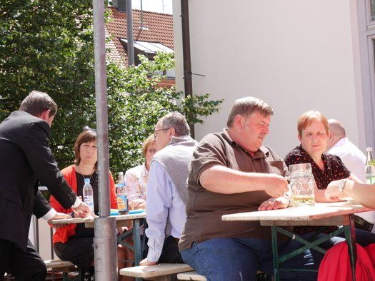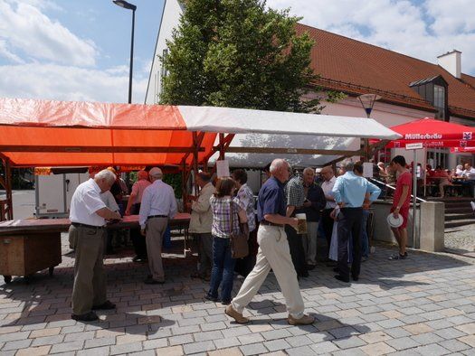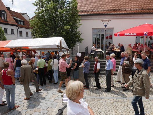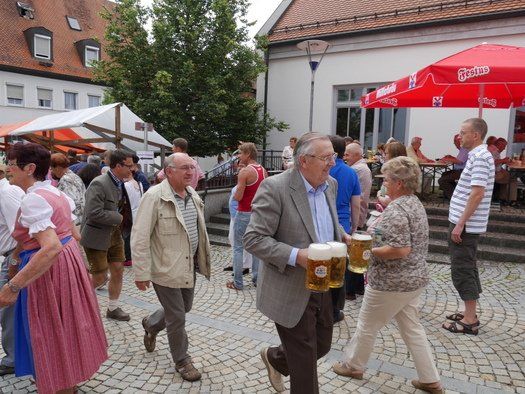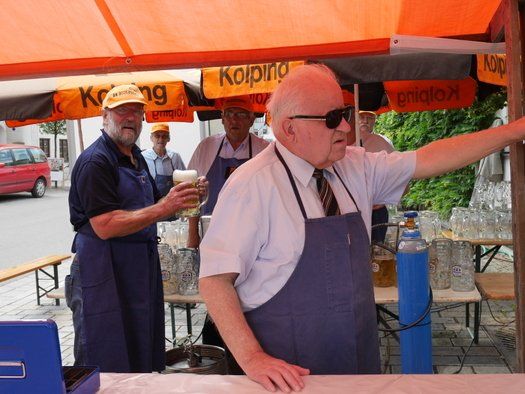 Vorstand Erwin Nischwitz und Stadt- und Kreisrat Franz Schmuttermayr wie immer friedlich vereint als Team beim Bierausschank, Stadtrat Martin Rohrmann traditionell beim Käse und der Schtod Max als Gast, der Tag war gerettet. Albert Gürtner überbrachte als zweiter Bürgermeister die Grüße der Stadt und gutes Gelingen.