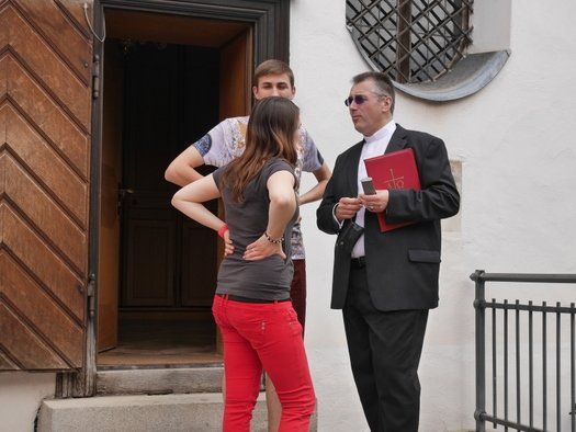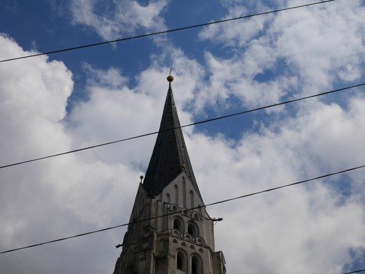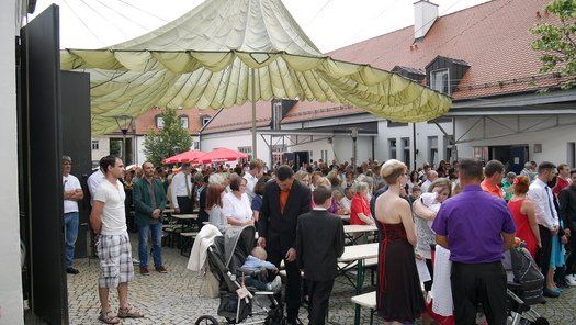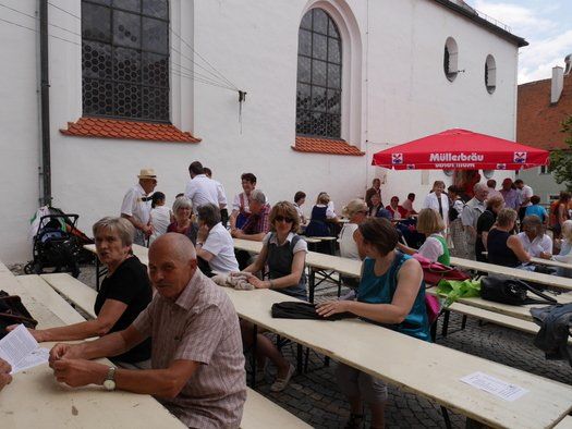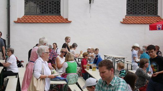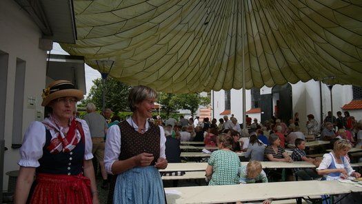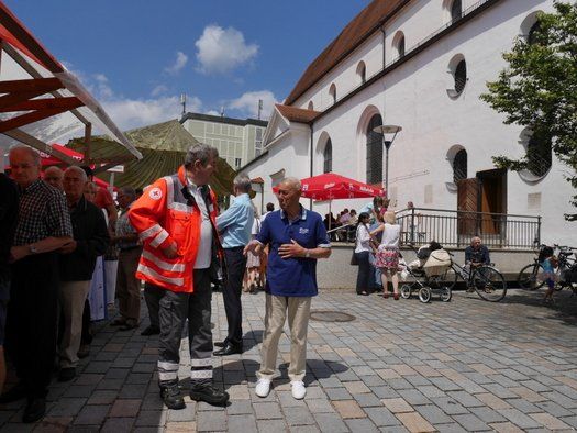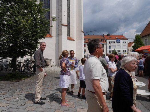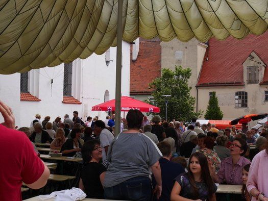 Da war er wieder, der gute Draht nach oben, bestes Wetter zum großen sommerlichen Pfarrfest unter dem weiten Lastenfallschirm am Fuße unserer prächtigen Stadtpfarrkirche St. Johannes Baptist.