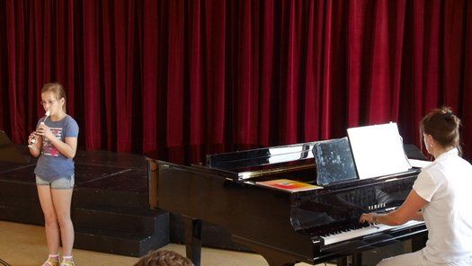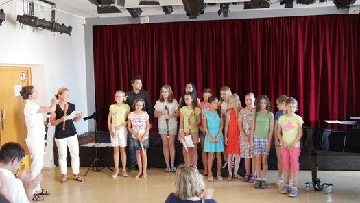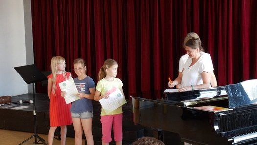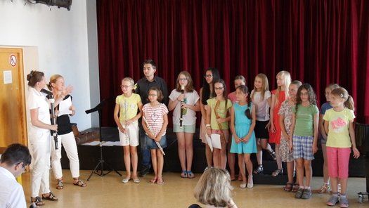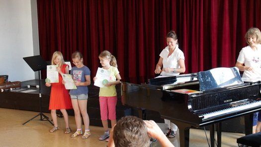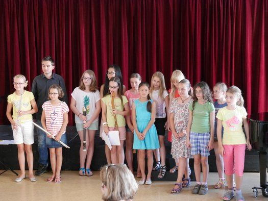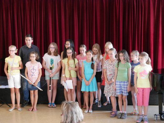 Die musikalische Mischung ist immer abwechslungsreich und nie langweilig. Manche Schüler spielen schon auf höchstem Niveau, für andere ist es der erste Auftritt, Lampenfieber inclusive. Den Abschluss bildete am Montag ein Quartett mit Ergänzung der Flötenabteilung, verstärkt durch eine begeisterte Mama. Alle Beteiligten durften noch zum großen Schlussapplaus nach vorne kommen und sich für das Familienalbum ablichten lassen.