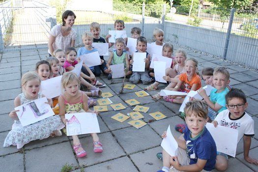 Die Vorschulkinder in der Kita Burzlbaam zeigen der städtischen Klimaschutzmanagerin Kathrin Merkert ihre bunten Bilder zum Thema „Mein Weg zur Kita“.