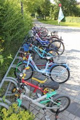 Vor dem Kindergarten Maria Rast in Niederscheyern steht nicht nur während der „Kindermeilen“-Aktionszeit ein großer Radl-Fuhrpark, hier kommen immer viele Mädchen und Buben mit dem Rad zum Kindergarten. // Im Kindergarten Maria Rast in Niederscheyern setzt der kleine Ludwig einen Stempel aufs Kindermeilen-Plakat, denn der Papa hat ihn mit dem Fahrrad zum Kindergarten gebracht.