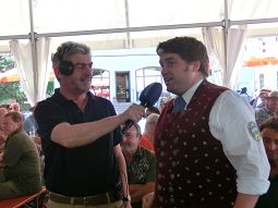 Die Moderatoren von Bayern 2, Ernest Lang und Veronika Lohmöller, stellten auf der Bühne vor dem Rathaus die Gastgeber, Familie Eberwein und die Dellnhauser Musikanten, vor. Immer wieder unterbrochen von musikalischen Einlagen, z.B. von der Marktkapelle Au oder den Neurosenheimern und den Dellnhauser Musikanten, nahm sich Moderator Ernest Lang viel Zeit für Interviews, z.B.mit dem Vorstand der Marktkapelle, Martin Krumbucher, einzelnen Mitwirkenden der Marktkapelle, den Geschwistern Eberwein oder auch dem Vorsitzenden der Abensquell Schützen, Anton Kuffer. Dieser hat mit seinen Schützen die Bewirtung auf dem Marktplatz übernommen, ein riesengroßes Zelt aufgebaut und mit ca 30 Mann vor Ort die gesamte kulinarische Versorgung hervorragend organisiert.