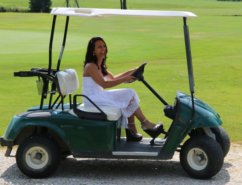 Golfspieler treffen auf schnelle Autos