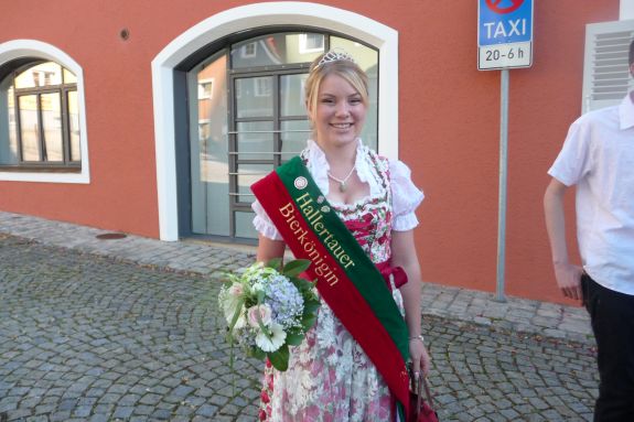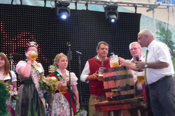 Bei bestem Wetter marschierten am Freitag sämtliche lokalen Vereine, Bier- und Hopfenköniginnen und diverse Gäste aus aller Welt zum Festgelände auf die Schöllwiese aus. Musikalisch angeführt von der Jugend- und Stadtkappelle, dem Spielmannszug aus Högertshausen sowie der Marktkapelle Au zog man vom Marktplatz aus in Richtung Festzelt, wo der offizielle Bieranstich durch die neugewählte Königin Sabine Schalk erfolgte.