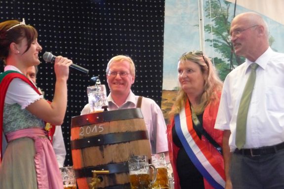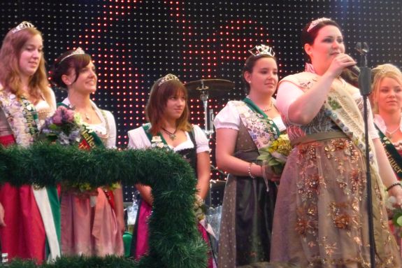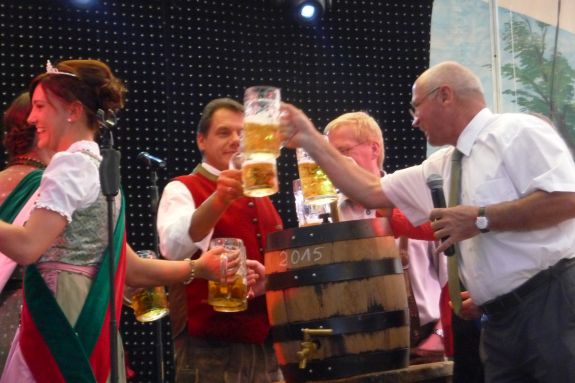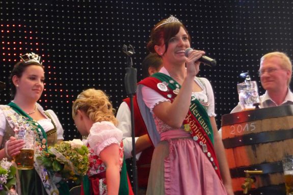 Nachdem die Auftaktveranstaltung am Donnerstag von der Besucherzahlen her etwas mäßig ausfiel, säumte am Freitag das feierfreudige Biervolk zahlreich die Bayernlandhalle der Wirtsfamilie Schöniger. Dabei ging es ziemlich interkulturell zu. Zur Vizebürgermeisterin Adeline Mèstre aus der französischen Partnerstadt gesellten sich Austauschüler aus Amerika, Istanbul und Norwegen, die derzeit in der Hopfenstadt verweilen. Auch das Hopfen-Dreigestirn um Johanna Reith, Daniela Kügler und Nadine Weber sowie die Siegenburger Hopfenkönigin Elisabeth Wurmdobler waren nach Mainburg gekommen. Stadtoberhaupt Sepp Reiser hieß alle ganz herzlich willkommen und wünschte einen guten Verlauf und viel Vergnügen am Hopfenfest. Ihre Fähigkeiten als frischgekührte Bierkönigin konnte Sabine Schalk beim Anstich des Festbierfassels gleich unter Beweis stellen. Ihre Hoheit meisterte die Aufgabe bravourös, sodass man vergnügt auf der Bühne zu einem „Prosit der Gemütlichkeit“ einstimmte.