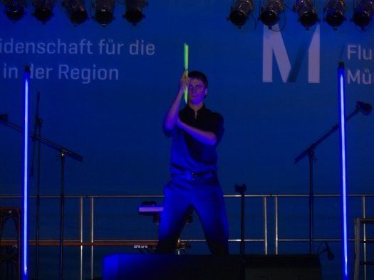 Etwas ganz Besonderes war auch das Pantomimische Percussions-Darstellungsspiel mit Michael Leopold. Bei diesem absolut außergewöhnlichen und einzigartigen Musikstück wurden vom Akteur bei stimmungsvoller Schwarzlichtbeleuchtung, pantomimisch, rhythmische Bewegungen mit Händen und Drum Stick, passend zur Musik, dargestellt. Michael Leopold wurde Bundessieger bei „Jugend musiziert“ , ist Kulturpreisträger der Stadt Pfaffenhofen und hat dieses Stück anlässlich seines Diplomkonzerts einstudiert.