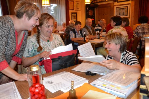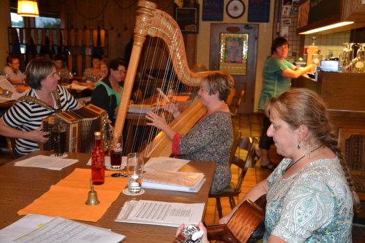 Bei beiden Volksmusikerinnen ist es immer eine Freude, zusammen mit ihnen zu singen, das macht den Erfolg dieser schon seit ganz vielen Jahren bestehenden Singstunde aus. Es werden dabei nicht nur bekannte Lieder, wie heute „Da ist der Wurm drin“, gesungen, sondern auch an jedem Abend immer wieder neue Lieder einstudiert, wie heute zum Beispiel „ Mir hamma zwoa schwarzbraune Rapperl“. Dabei freut sich Irmi Grünwald immer narrisch, wenn das Singen gleich beim ersten Mal einigermaßen klappt. Und heute konnten die beiden Musikerinnen eine Kollegin aus München an der Harfe begrüßen, Elisabeth Grande, die heuer zum zweiten Mal dabei war. Sie zeigte sich begeistert von der Stimmung, dem Elan und Schwung, der beim Singen herrscht.