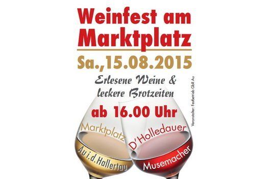 Am Samstag, den 15.08.2015 findet erstmals ein großes Weinfest auf dem Auer Marktplatz statt. Beginn ist um 16 Uhr. Für das leibliche Wohl ist bestens gesorgt. An verschiedenen Marktständen werden erlesene Weine angeboten. Selbstverständlich gibt es auch eine große Auswahl an eigens zubereiteten Brotzeitschmankerln. „D'Holledauer Musemacher“ sorgen für die musikalische Umrahmung und die entsprechende Stimmung. Die gesamte Bevölkerung aus Nah und Fern ist herzlich eingeladen.