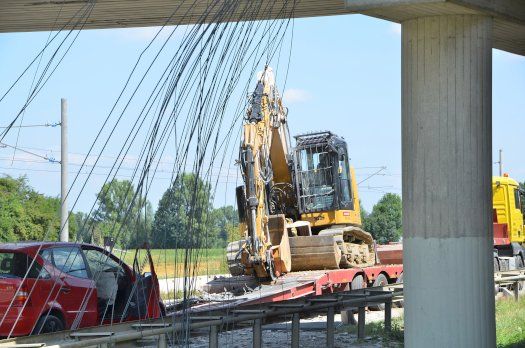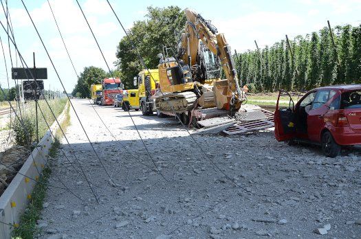 Der Unfall passierte am heutigen Vormittag Staatsstraße 2232. Gegen 11.30 Uhr fuhr der 39-jährige Fahrer des Lkw von Pfaffenhofen in Richtung Rohrbach. Kurz nach der Abzweigung in Richtung Walkersbach führt eine Brücke über die Staatstraße und die parallel verlaufende Bahnstrecke München – Ingolstadt. Da der Bagger nach ersten Ermittlungen der Polizei falsch aufgeladen wurde, ragte der Baggerarm zu hoch hinaus und riss beim Unterfahren der Brücke tragende Teile aus dem Betonwerk heraus.