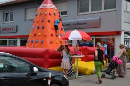 Auch eine Straße im Gewerbegebiet kann ihren Charme ausspielen, wenn sich alle etwas Mühe geben – diesen Eindruck konnten die Besucher gewinnen, als sie, angelockt von der Ankündigung eines Straßenfestes, trotz hoher Temperaturen in die Raiffeisenstraße strömten. Zumindest im hinteren Teil der Straße, in dem die Geschäfte sind, war das so.
