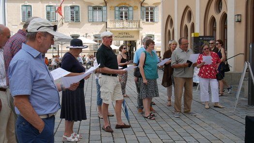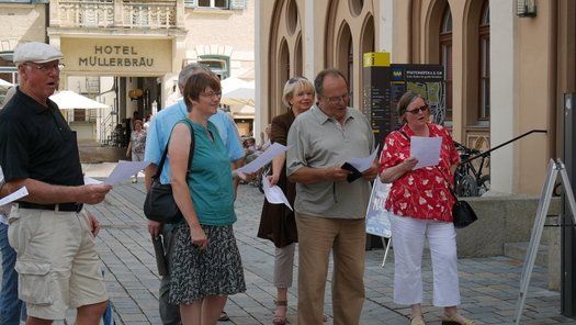Altbürgermeister Hans Prechter schloss sich spontan mit seiner Stadtführungsgruppe dem deftigen Gesang zur Moritat „S traurig aber wahr“ an. Ähnlichkeiten mit noch lebenden Personen oder Ereignissen schloss er allerdings aus. Nach einem kurzen Regenschauer, der Himmel weinte einfach spontan mit, füllte sich der Hauptplatz mit seinem buntem Markttreiben zusehends.
