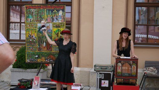 Wie hieß es in der Ankündigung: „Umrahmt werden die Moritatenlieder musikalisch von einer historischen Handdrehorgel und farbigen Schautafeln. Ihre Lieder erzählen von Räubern, Handwerkern und Soldaten aber auch von Liebe, Leid und Abschied und aus Missetaten und Anekdoten des Alltags kann jeder seine moralische Lehre über Recht und Ordnung ziehen.“