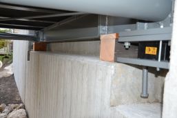Doch die Brücke ist noch nicht auf ihrem endgültigen Platz, sie schwebt mehr oder weniger über der Ilm, da sie erst einmal auf Holzblöcken abgesetzt wurde, bevor nach Erledigung der Feinarbeiten die endgültige Absenkung der Brücke auf die Betonsockel erfolgen kann.