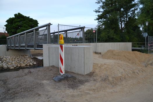 Gegenüber von den Sportplätzen wird schon seit Monaten im Rahmen des Hochwasserschutzes gebaut, Schutzmauern wurden entlang des Gießgrabens sowie der Ilm im Bereich Zimmerei Alt betoniert, ein Durchfluss für den Gießgraben unter dem zukünftigen Deich eingebaut und die Brückenköpfe für die neue Brücke errichtet. Und heute wurde im Laufe des Tages die Fußgängerbrücke in einem Stück auf die Brückenköpfe gesenkt.