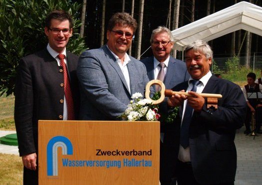 „Das gelungene Werk der Öffentlichkeit übergeben“. 5,3 Millionen Euro wurden in zwei neue Tiefbrunnen und ein neues Pumpwerk mit zwei Wasserspeicherkammern von je 1.500 Kubikmeter Wasser investiert. Zur offiziellen Einweihung begrüßten der Vorsitzende des Wasserzweckverbands Josef Hillerbrand und stellvertretender Vorsitzender Karl Ecker ihre zahlreichen Gäste. Auch Landrat Josef Hauner war gekommen um ein Grußwort zu sprechen. 120 Liter Wasser verbraucht der Deutsche Bürger im Durchschnitt pro Tag. Das neue Pumpkraftwerk sichert für die Hallertau diese benötigte Menge an Trinkwasser und vor allem beste Qualität. Durch die notwendige Wasseraufbereitung wird das Grundwasser, das aus enormer Tiefe kommt, mit Sauerstoff angereichert und das Eisen abgefiltert. Somit ist es qualitätsmäßig mit dem Wasser in Flaschen auf gleicher Höhe.