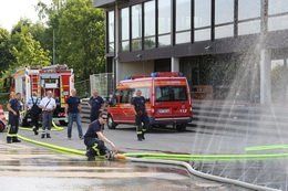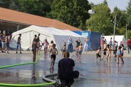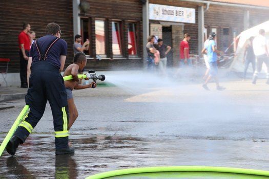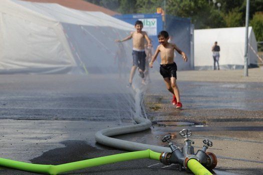 Und so staunten die Asylbewerber am Freitagnachmittag nicht schlecht, als plötzlich zwei Feuerwehrfahrzeuge auf den Hof vor ihrer Unterkunft fuhren und die Helfer begannen, Schläuche auszurollen. Als dann aus den Schläuchen fein verteiltes Wasser spritzte, gab es bei den sehr warmen Temperaturen für die Kinder kein Halten mehr und sie hüpften munter durch das kühlende Nass. Doch nicht nur die Kinder vergaßen die Strapazen Ihrer Flucht. Auch den Erwachsenen war die Freude sichtlich anzusehen, als sie mit den gespendeten Fußbällen spielten und ebenfalls durch den Wassernebel liefen.