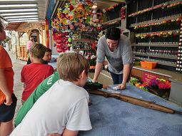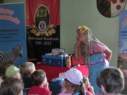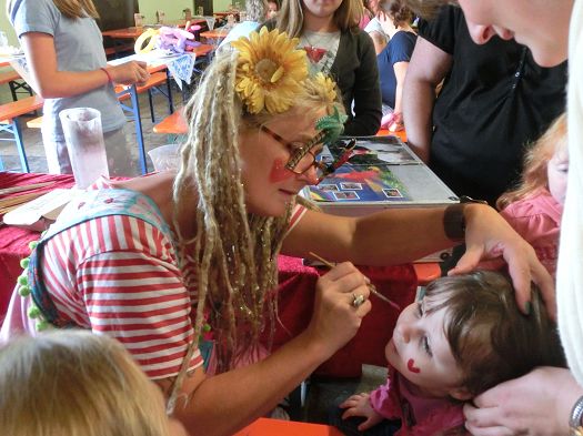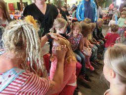 An den Wurf- und Schießbuden war genauso großer Betrieb wie beim Kinderkarussel oder der Schiffschaukel. Die meisten Kinder versammelten sich allerdings in der Hopfenhalle um Monique Sonnenschein. Zuerst durfte sich jedes Kind bei ihr schminken lassen, danach begann sie mit ihrer lustigen Unterhaltungsnummer. Als Clown begeisterte sie die Kinder, mal mit Geige, mal mit Zaubereien. Und diese folgten hochkonzentriert dem Programm, schrien begeistert die Antworten auf ihre Fragen und lachten sich krumm, wenn wieder alles angeblich schieflief. Die Mütter konnten sich dabei ganz entspannt eine Brotzeit schmecken lassen.