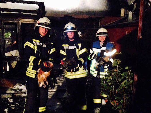 Glück im Unglück für diese drei Hühner: Sie konnten gerade noch rechtzeitig von den Feuerwehrleuten gerettet werden. Einsatzfoto Feuerwehr Reichertshofen