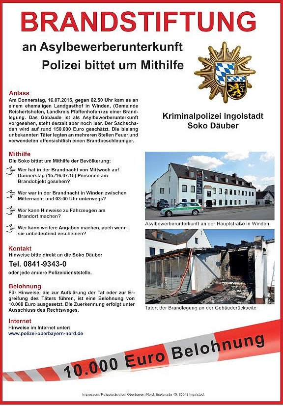 Weiterhin mit Hochdruck arbeitet die Sonderkommission „Däuber“ der Kriminalpolizei Ingolstadt an der Aufklärung der Straftat. Der Landgasthof soll als Unterkunft für Asylbewerber dienen, die schon in wenigen Wochen eintreffen werden.