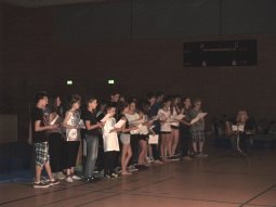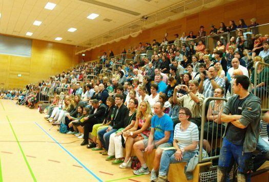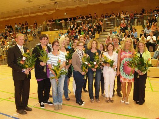 Um 18.30 Uhr ging es dann zur offiziellen Verabschiedung in die Hopfenlandhalle, mit Grußworten des Schulleiters Simon Pelczer und Bürgermeister Karl Ecker. Das von den Schülern und Lehrern einstudierte Showprogramm kam bestes bei den vielen Besuchern an. Showeinlagen, wie das Kasten- und Trampolinspringen „Jump“ oder der Song „I see fire“ von Ed Sheeran sorgten für viel Applaus. Allen Lehrerinnen und Lehrern wurde zum Abschied ein kleines Präsent überreicht. Danach konnte noch einmal kräftig weitergefeiert werden, bis gegen 22.00 Uhr das sehnsüchtig erwartete Abschlussfeuerwerk auf dem Dach der „alten“ Mittelschule gezündet wurde.