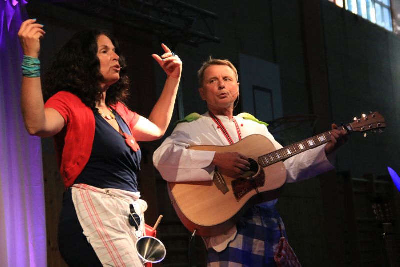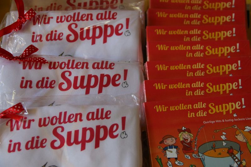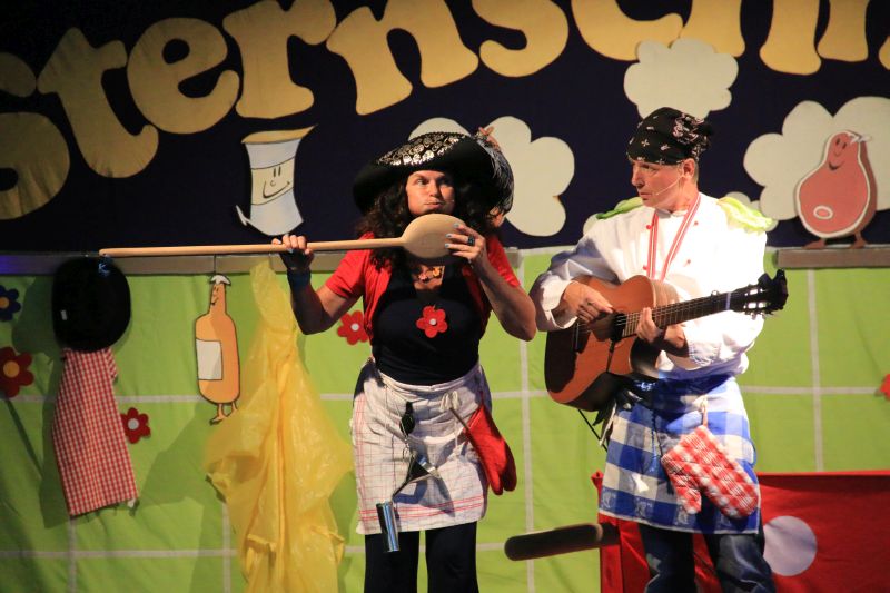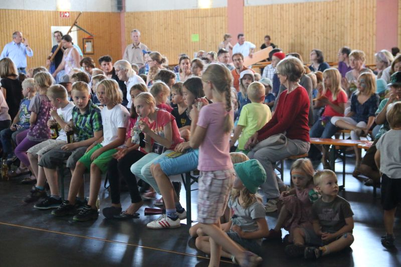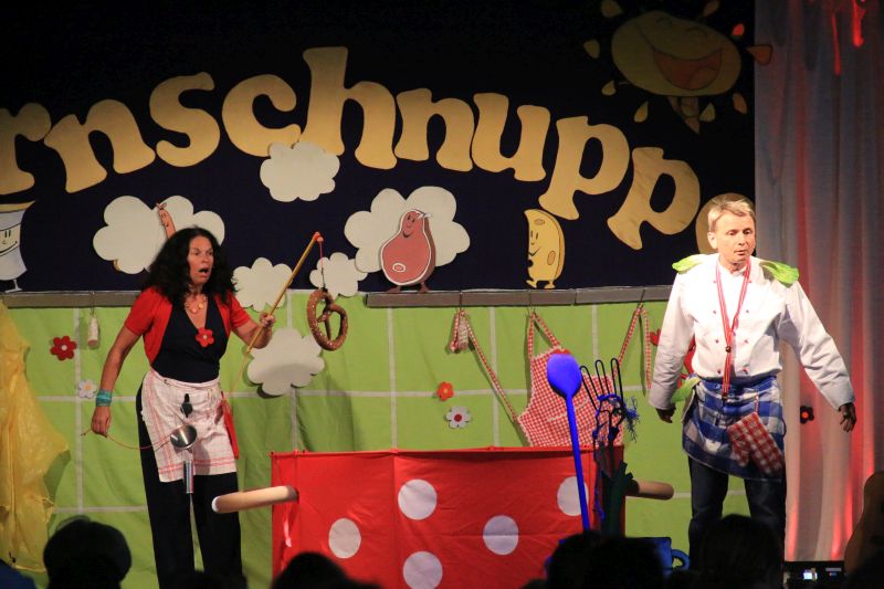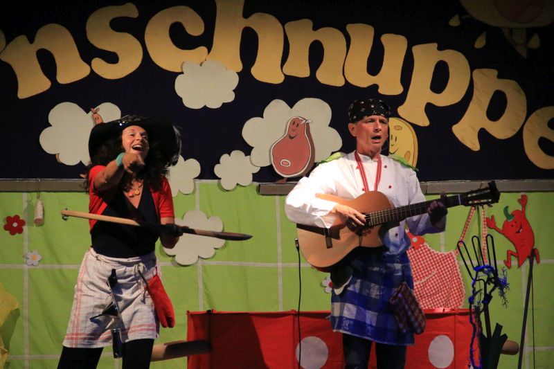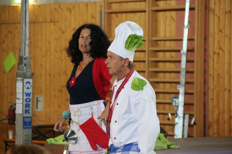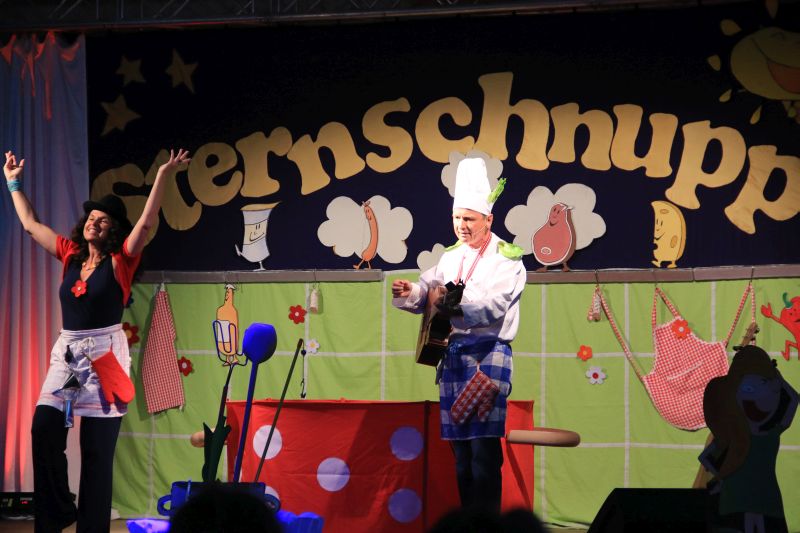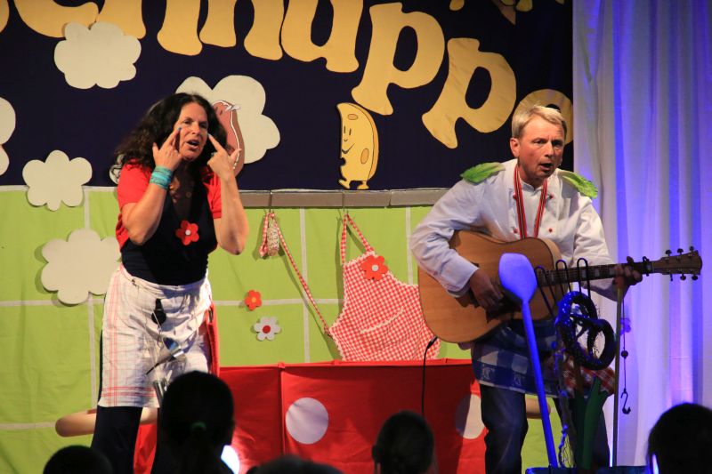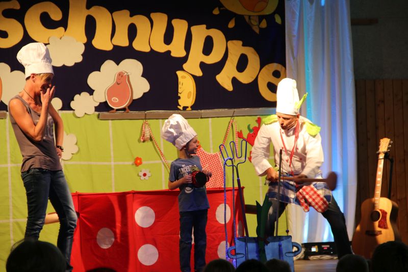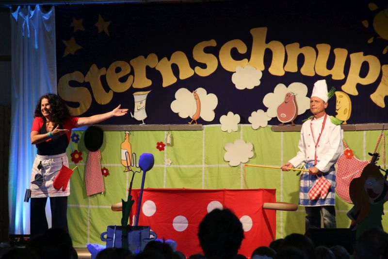 Einen ganz besonderen Höhepunkt hatte sich die Gemeinde dieses Jahr einfallen lassen: der 13-Knöpfe-Koch Werner Meier und die sternschnuppige schnuckelige Margit Sarholz, gemeinsam besser bekannt als "Sternschnuppe", hatten einen Auftritt in der Turnhalle. Und die zahlreich erschienenen Kinder wollten augenscheinlich "Alle in die Suppe", so nämlich der Titel des aufgeführten Programms. Beginnen mussten Werner und Margot mit vielstimmiger Unterstützung aus zig Kinderkehlen mit "1-2-3- Ruuuuuheee" - das war's aber dann auch mit denen, die mehr zum Ratschen als zum Zuschauen und Mitmachen Platz genommen hatten. Das Sternschnuppen-Programm ließ keinen Raum mehr für Störenfriede und Nicht-Mitmacher, 5 Schöpflöffel Noten hatten Sternschnuppe mitgebracht und f(r)ischten einen um den anderen programmtechnischen Höhepunkt aus dem Bassin. Ob die Eiernudel für die ganze Familie, den Hut ("Der steht Dir aber gut") oder die Regenpiraten - die Kinder waren immer eingebunden und voll dabei. Und damit den Mamis und Papis nicht langweilig wurde, durften auch sie das Programm auf der Bühne aktiv mitgestalten. Wer beim "Gong tschigigidi" nicht mitmachen würde, so war ja schließlich die Drohung, der muss später in der Küche helfen. Höhepunkt des Auftritts war - wie nicht anders zu erwarten - natürlich "Die Brezn-Beißer-Bande", bei der annähernd alle Anwesenden mitsingen konnten.