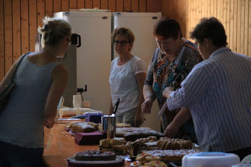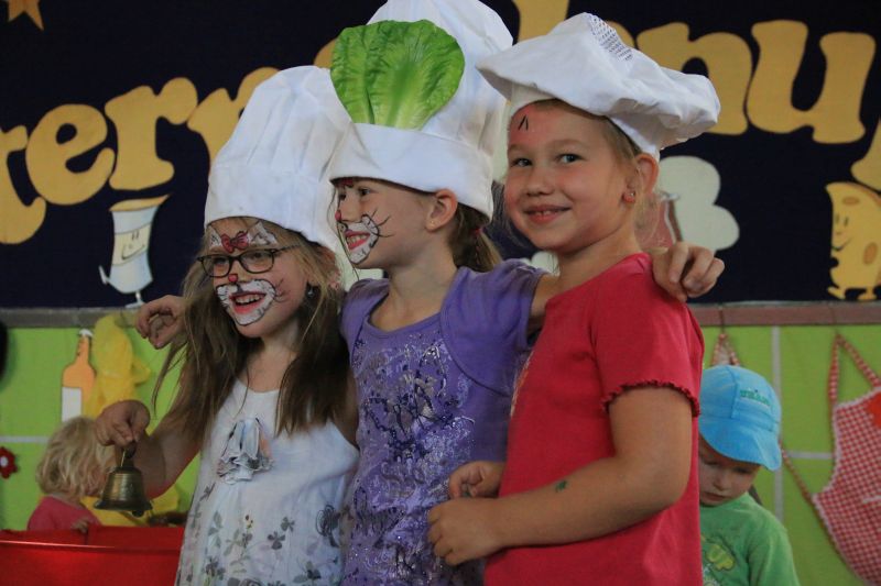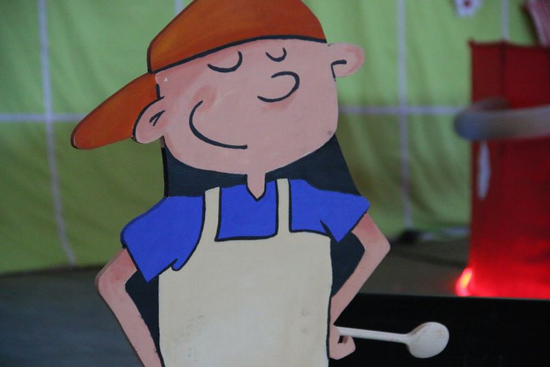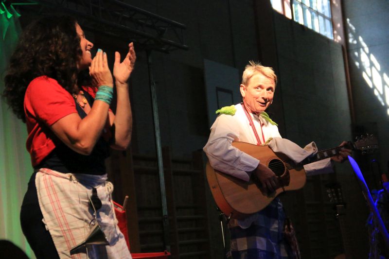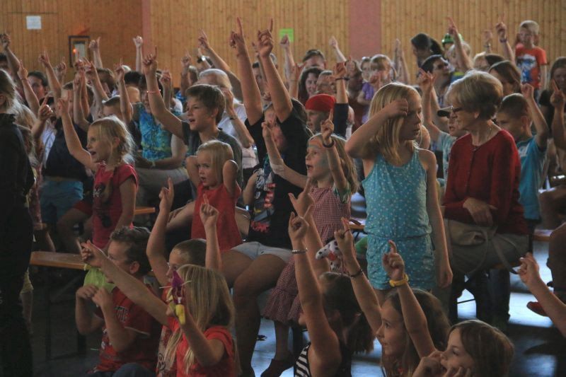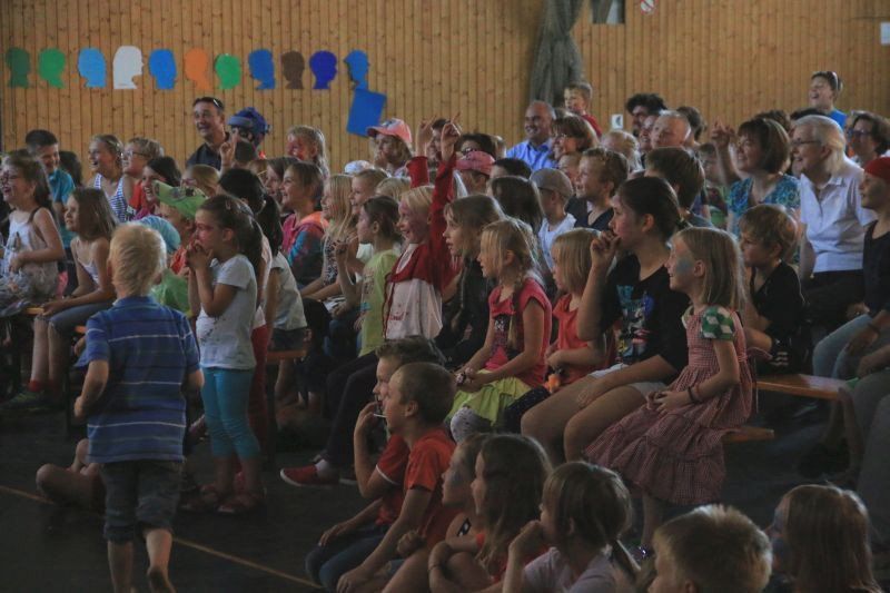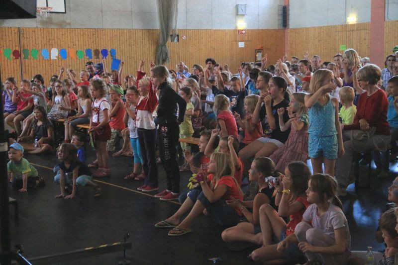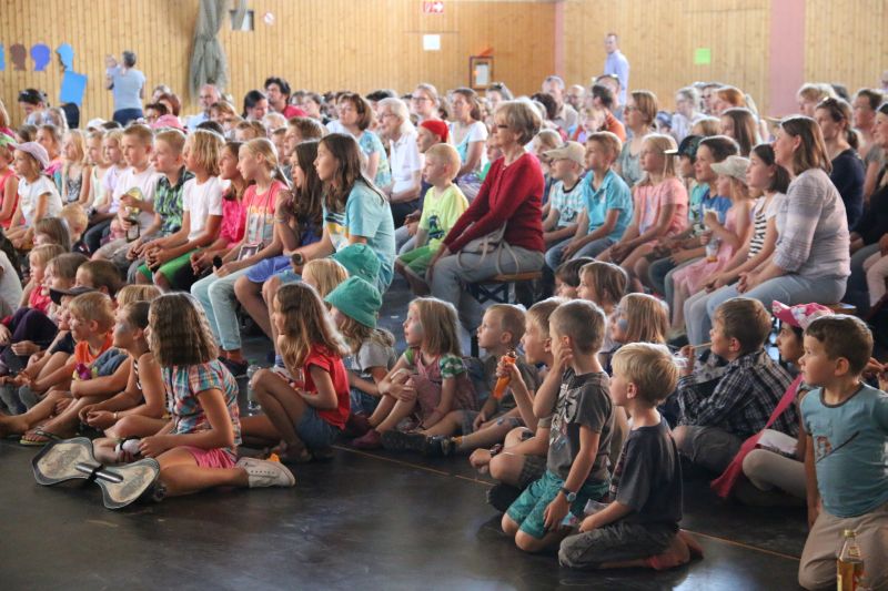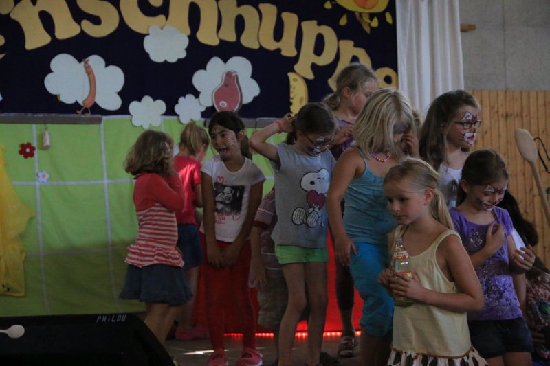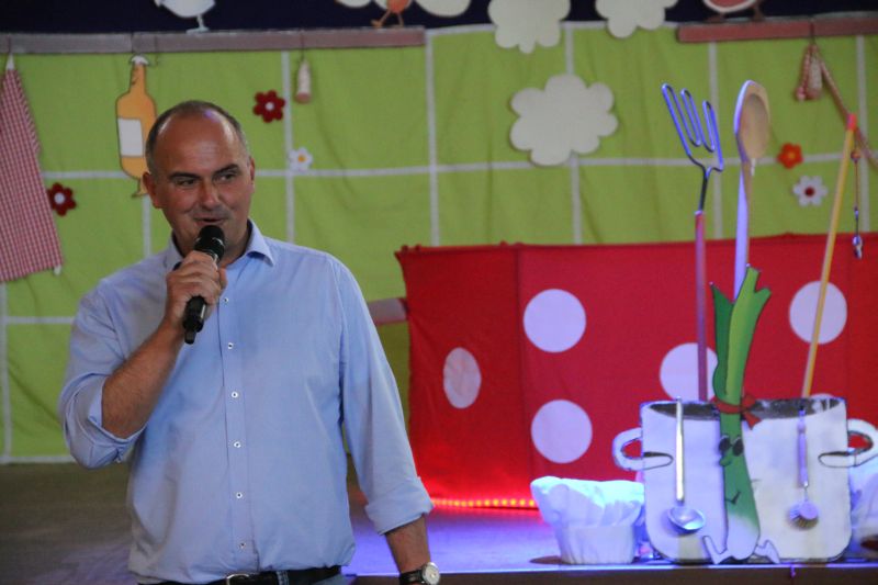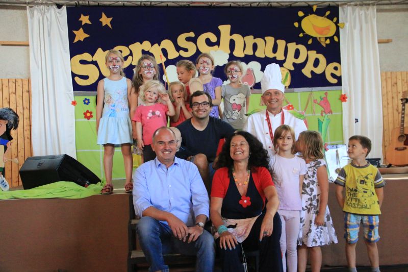 Einen ganz besonderen Höhepunkt hatte sich die Gemeinde dieses Jahr einfallen lassen: der 13-Knöpfe-Koch Werner Meier und die sternschnuppige schnuckelige Margit Sarholz, gemeinsam besser bekannt als "Sternschnuppe", hatten einen Auftritt in der Turnhalle. Und die zahlreich erschienenen Kinder wollten augenscheinlich "Alle in die Suppe", so nämlich der Titel des aufgeführten Programms. Beginnen mussten Werner und Margot mit vielstimmiger Unterstützung aus zig Kinderkehlen mit "1-2-3- Ruuuuuheee" - das war's aber dann auch mit denen, die mehr zum Ratschen als zum Zuschauen und Mitmachen Platz genommen hatten. Das Sternschnuppen-Programm ließ keinen Raum mehr für Störenfriede und Nicht-Mitmacher, 5 Schöpflöffel Noten hatten Sternschnuppe mitgebracht und f(r)ischten einen um den anderen programmtechnischen Höhepunkt aus dem Bassin. Ob die Eiernudel für die ganze Familie, den Hut ("Der steht Dir aber gut") oder die Regenpiraten - die Kinder waren immer eingebunden und voll dabei. Und damit den Mamis und Papis nicht langweilig wurde, durften auch sie das Programm auf der Bühne aktiv mitgestalten. Wer beim "Gong tschigigidi" nicht mitmachen würde, so war ja schließlich die Drohung, der muss später in der Küche helfen. Höhepunkt des Auftritts war - wie nicht anders zu erwarten - natürlich "Die Brezn-Beißer-Bande", bei der annähernd alle Anwesenden mitsingen konnten.