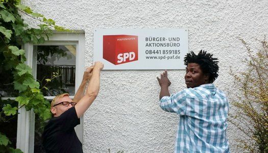 Alexander Käser, SPD-Mitarbeiter und Olola Ogungbe aus Nigeria beim Abmontieren des Büroschildes