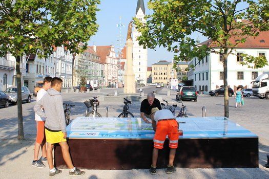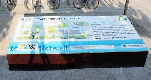 Ergänzend zu den Baustellführungen und den im Umfeld der Gartenschaubereiche zwischenzeitlich angebrachten Visualisierungen wurde nun ein Informationspodest am Hauptplatz durch die Natur in Pfaffenhofen a. d. Ilm 2017 GmbH aufgestellt.