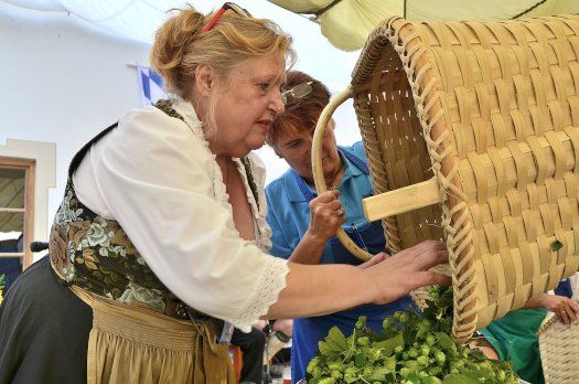 Auf einer Nebenbühne konnten unter der Anleitung von Hopfenmeisterin Uschi Kufer alte Zeiten ebenso fröhliche wie spürbare Urstände feiern beim händischen Brocken des Hopfens. Wer sich dabei bewährte, bekam sogar eine eigene Urkunde ausgehändigt.