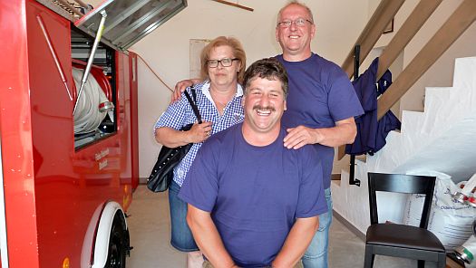Vorstand Martin Mittermeier (knieend) und 1. Kommandant Ludwig Feiner mit Frau freuen sich über ihr neues Domizil