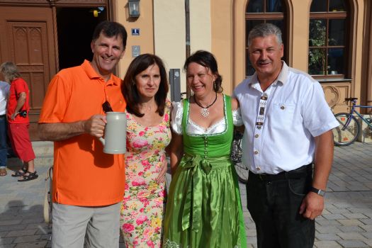 Neben den beiden Königinnen waren die Festwirte anwesend, die kurz das Programm in ihren Zelten vorstellten wie Julia Spitzenberger für das Spitzzelt, Sigi Schön, der neue Wirt für das Traditionszelt und Lorenz Stift für das große Festzelt. Außerdem kamen natürlich auch die Vertreter der beiden Pfaffenhofener Brauereien zu Wort, die natürlich die gute Qualität des süffigen und bekömmlichen Bieres lobten. Und Peter Heinzlmair konnte vor der Rathaustür der Erfinderin des Hopfensecco, Hildegard Heindl, eine alte Bekannte vorstellen, die vor 17 Jahren von Pfaffenhofen nach Florida auswanderte und dort im Konsulat arbeitet: Ilona Friedman geb. Schultes, die mit ihrem Mann Scott derzeit in Pfaffenhofen weilt.