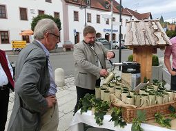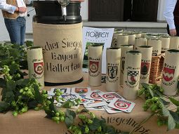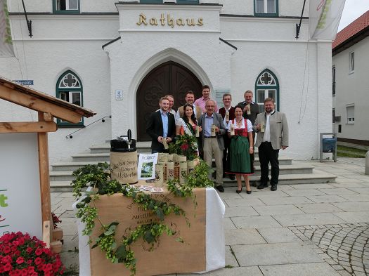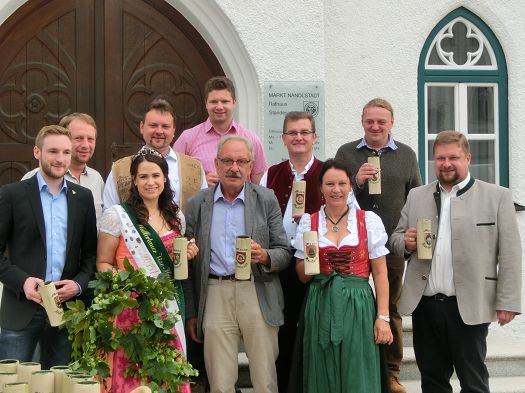 Vor dem Rathaus Nandlstadt wurde gestern das Programm für das 5. Hopfensiegelfest am 6. September und das extra dafür gebraute Bier der Forschungsbrauerei Weihenstephan der Presse vorgestellt. Dafür hatte die Initiatorin des Festes, Hildegard Heindl, einen stilvoll dekorierten Tisch mit den selbstgemachten Bierkrügerln, 15 Stück, für jeden Siegelbezirk einen, arrangiert.