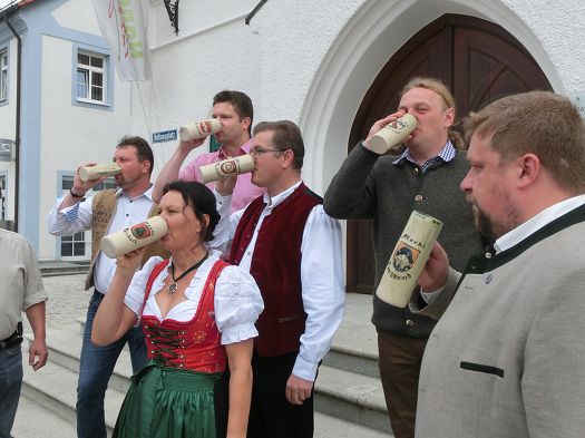 Natürlich hatte Dr. Tippmann auch ein Faß des neuen Bieres dabei, so dass die Anwesenden, 2. Bürgermeister Jens-Uwe Klein, 3. Bürgermeister Gerhard Betz, Vizehopfenkönigin Helena Kreitmair, Kulturreferent Rainer Klier, Feuerwehrkommandant Michael Wagensonner sowie Geschäftsleiter Michael Reithmeier gleich eine Kostprobe bekamen und sehr begeistert davon waren.