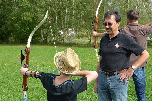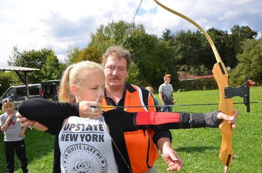Alle notwendigen Materialien wie Bogen, Pfeile, Arm- und Fingerschutz stellten die „Bogenschützen Niederlauterbach“ den Kindern zur Verfügung. Die 7- bis 13-Jährigen Buben und Mädchen mussten lediglich Neugier aber auch eine gewisse Disziplin mitbringen. Denn jede Art von Schießsport verlangt nach einem besonders verantwortungsvollen Umgang. In diesem Fall eben mit Pfeil und Bogen. Dass sich Sicherheit und Spaß nicht gegenseitig ausschließen müssen, dafür sorgte Vereinschef Martin Rieder zusammen mit Günter Dietrich, der „Jugendleiter Bogen“ ist, Marko Kormansek und Reinhard Rehner.