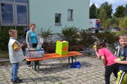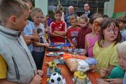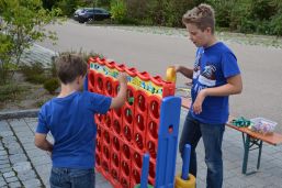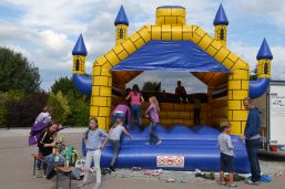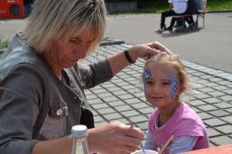 Für das Abschlussfest waren Hüpfburg, Fußballtorwand, Bonbonschleuder, ein elektronischer Schießstand und Stände für Kaffee, Kuchen, Steaksemmeln und Würstl aufgebaut und die Gäste hatten genügend Platz auf den bereitgestellten Bierzeltgarnituren. Helfer aus den Vereinen (TSV, Schlossschützen und Feuerwehr) standen bereit, um die Kinder an den Spielständen zu betreuen. Beim Feuerwehrauto durften die Kleinen ihr Können mit dem Feuerwehrschlauch zeigen und versuchen, die aufgebauten großen Dosen herunterzuspritzen. Und beim elektronischen Schießstand konnten sie mit Lasergewehren versuchen „ins Schwarze“ zu treffen. Der Förderverein des Kindergartens Sternschnuppe unterstützte die Feier mit Kaffee und Kuchen, Steaksemmeln und Würstln. Außerdem konnten sich die Kinder schminken lassen sowie Rohrbazi-Buttons prägen.