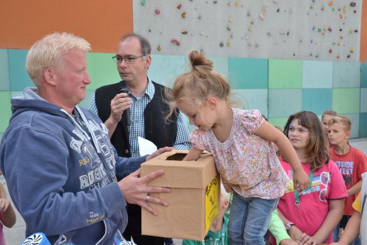 die kleine Glücksfee zog die Gewinner der Verlosungsaktion mit Jugendbeauftragtem Jörg Mittermeier