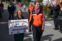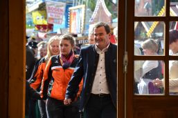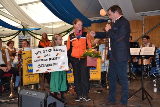 Der zweite Bürgermeister Pfaffenhofens, Albert Gürtner, hatte schon beim Standkonzert der Musikkapellen auf dem Hauptplatz gehört, dass die 16-jährige Stefanie Reisner Deutsche Jugendmeisterin der Sportschützen in der Kategorie Luftgewehr (weiblich) geworden war. Das war für ihn natürlich Anlass genug, Stefanie und ihre Begleitung auf das Volksfest zu lotsen, um ihr im gut besuchten Festzelt mit einem Blumenstrauß zum Meistertitel zu gratulieren. Stefanie hatte mit dem fantastischen Ergebnis von 396 Punkten von maximal 400 Punkten gewonnen, eine Leistung, die absolut hervorragend ist. Wenn man die Scheiben der vier Durchläufe sieht, die ab 11:45 Uhr begannen, kann man nur staunen, wie gut sie immer wieder die Mitte der Scheiben getroffen hat – dazu brauchte sie schon eine sehr ruhige Hand, so dass ihre Freudentränen bei der Begrüßung wirklich eine Hochspannung bei ihr gelöst hatten. Zur Freude aller Anwesenden durfte sie dann auch die Stadtkapelle auf der Bühne dirigieren- und ihre kleine Cousine strahlte mit dem Willkommensschild.