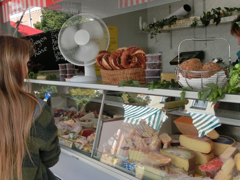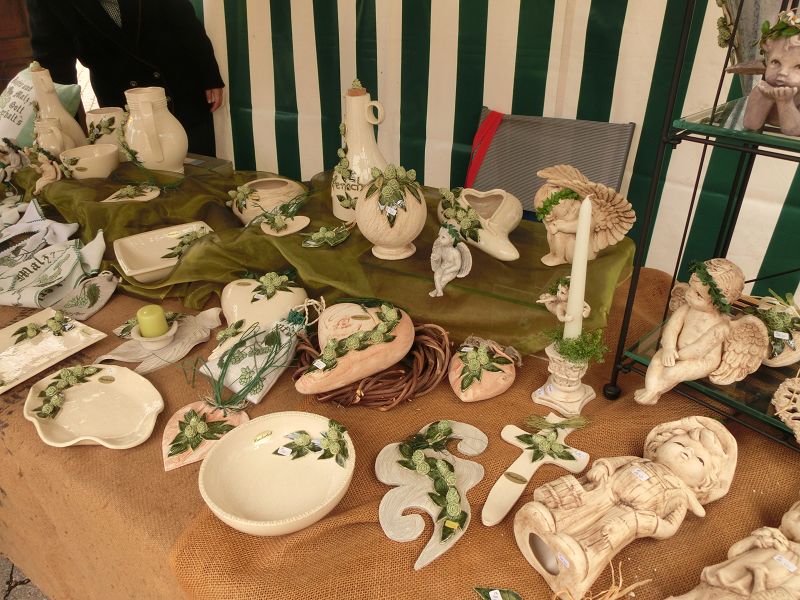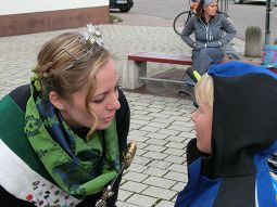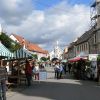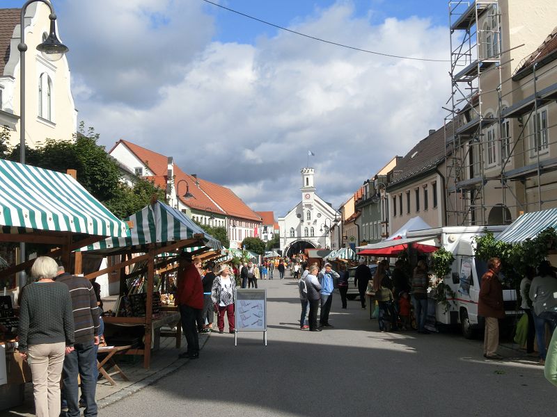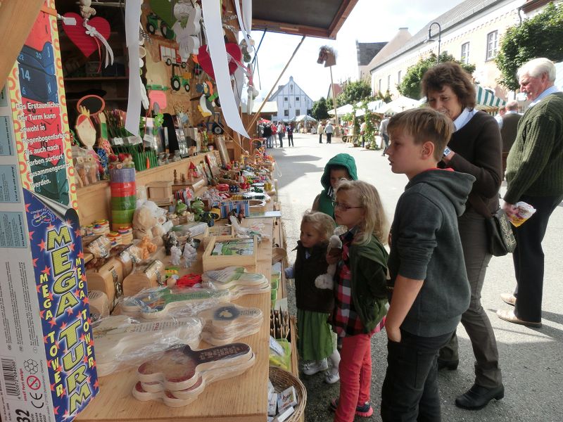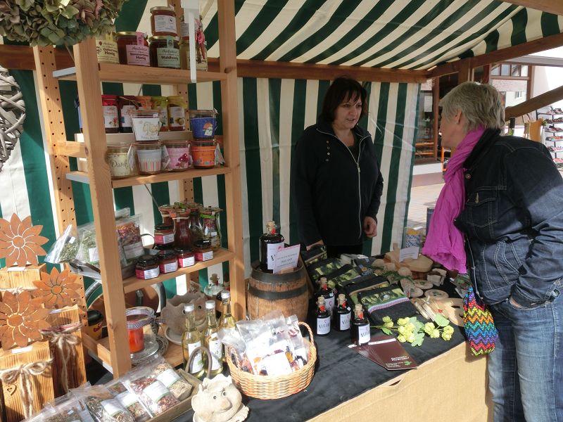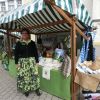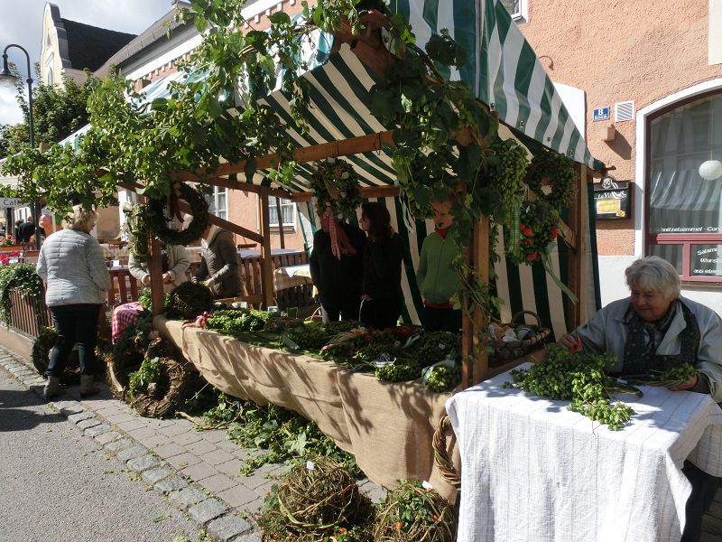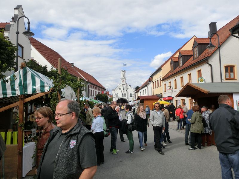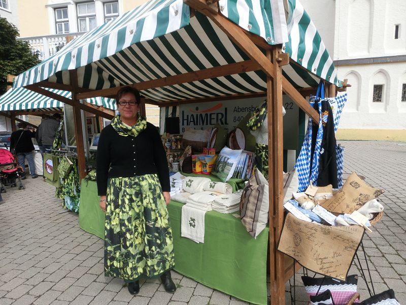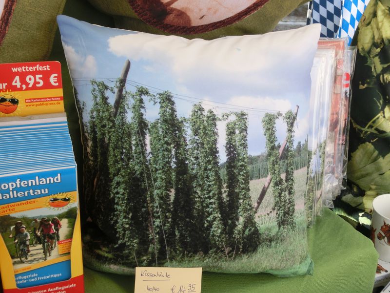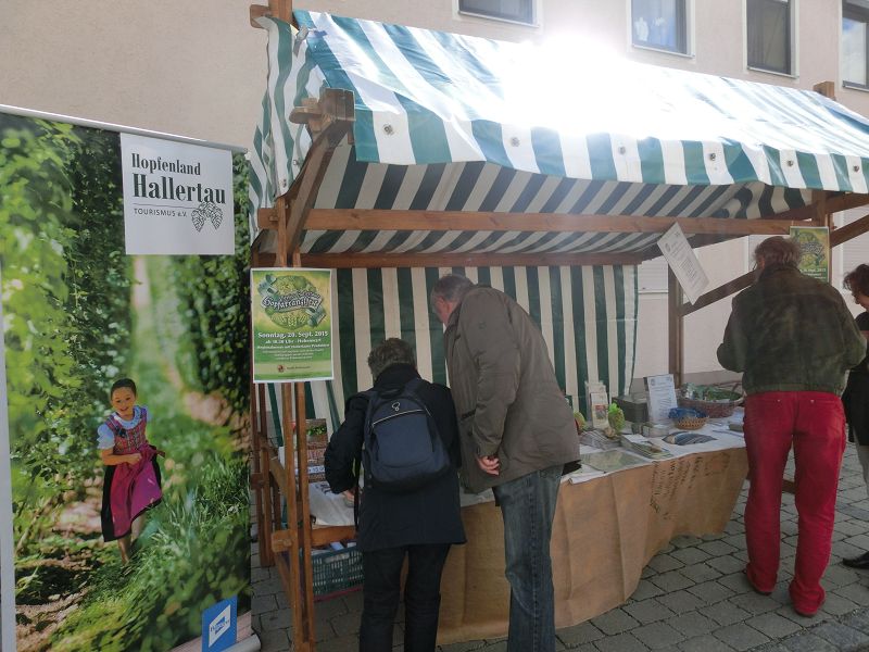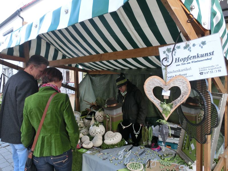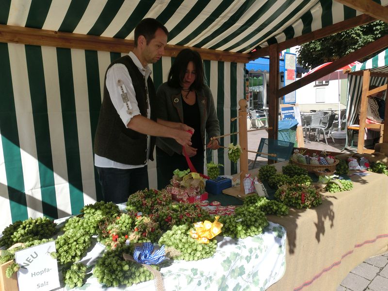 Im Anschluss an den offiziellen Teil flanierten die meisten Besucher über die Hauptstraße, wo zahlreiche Buden und Stände rund um den Hopfen aufgebaut waren. Da gab es neben diversen Ständen mit unterschiedlichsten Hopfenkränzen und - gestecken auch Hopfenschmuck, Hopfenkeramik, Hopfenfotographien, ja sogar Bettwäsche und Dirndlschürzen mit Hopfenmotiven. Der Tourismusverband Hallertau war ebenso vertreten wie Stände mit kulinarischen Besonderheiten, z.B. Hopfenlikör und Honig, Marmeladen und Käse aus der Region.