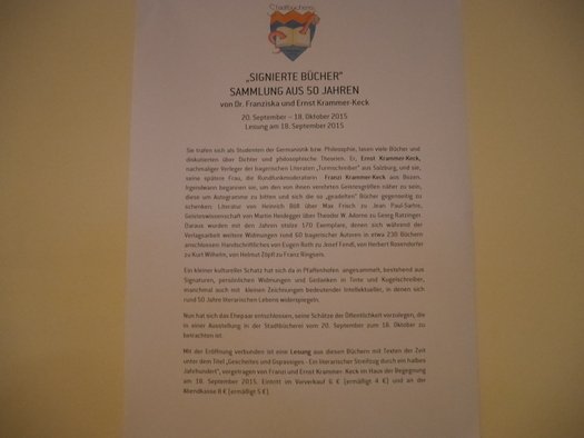 Diesmal haben sie aus ihrem schier unermesslichen Fundus, 76 signierte Einzelstücke für die Öffentlichkeit bereitgestellt. Von Adorno über Böll, Frisch, Grass, Jens, Kästner, Satre, Simmel, bis Zuckmayer, um nur die farbigsten zu nennen, finden sich fast alle Halbgötter des schriftstellerischen Olymps, in der Stadtbücherei Pfaffenhofen ein.