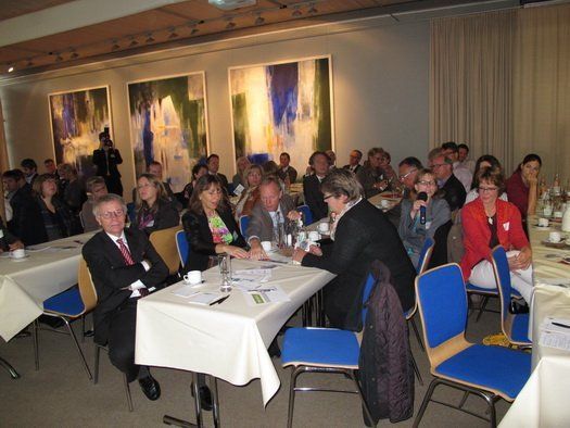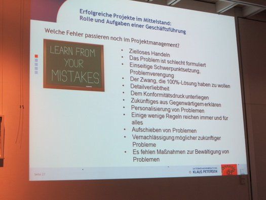 Coach Klaus Petersen stellte zum letzten Unternehmerfrühstück in 2015 das Projektmanagement in den Mittelpunkt von Vortrag und Fragen, welche Fehler gerne begangen werden oder wie erfolgreich voranzugehen sei. Danach herrschte das Frühstücksbuffet von Frau Waldinger, Larsbach, kreativ wie immer, zum Netzwerken einladend.